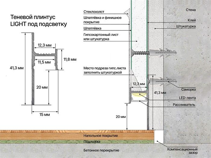 За счет создания небольшого зазора между стеной и полом, теневой профиль визуально поднимает стену на пару сантиметров. Это добавляет стене объема и подчеркивает архитектуру помещения. С помощью незаметной детали Вы создаете стильное пространство, в котором уютно и красиво жить.