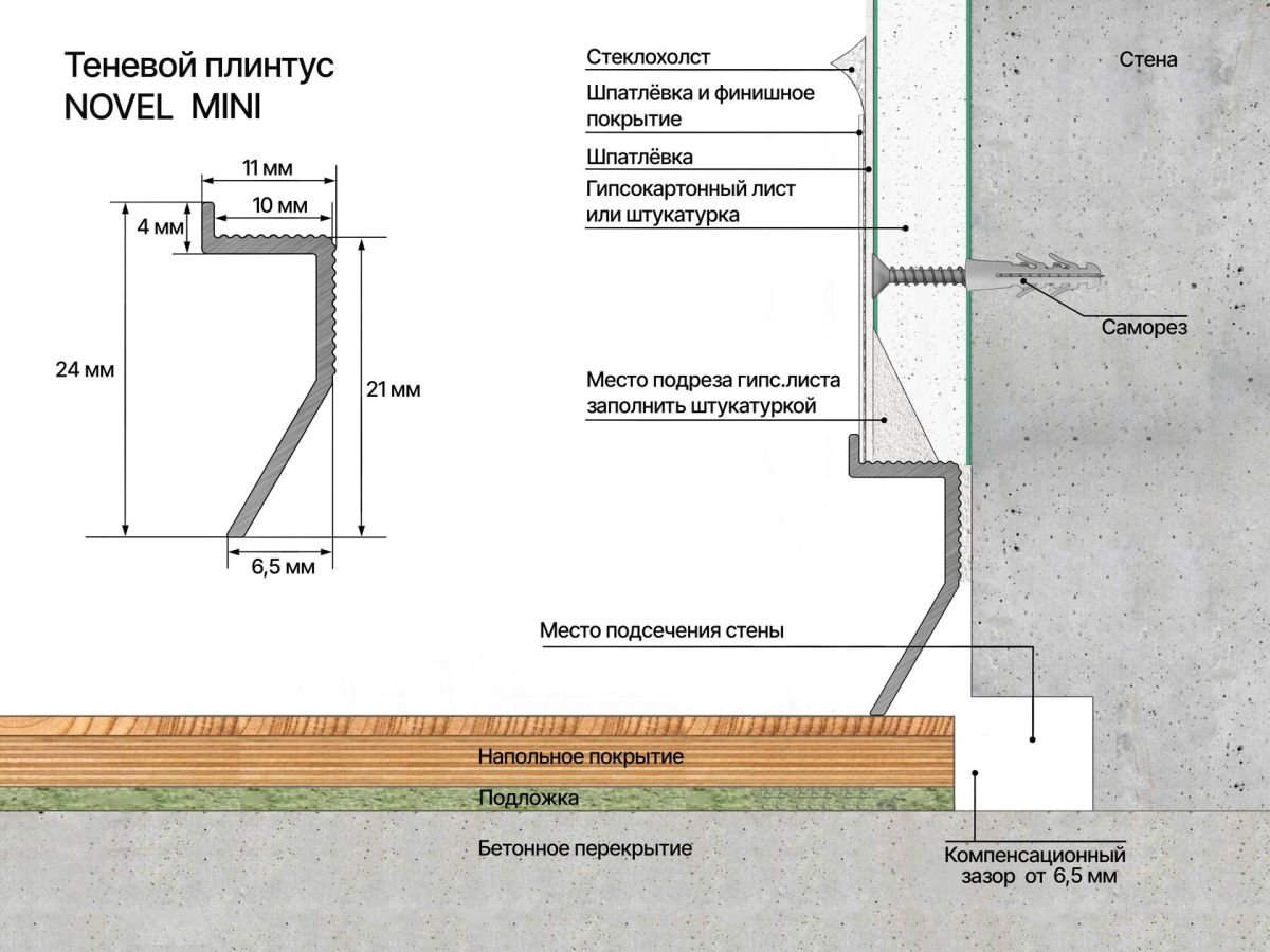 Теневой плинтус Novel не только создает эффект "парящей" стены, но и решает практические задачи. Бортик толщиной 4 мм маскирует неровности обрезанных панелей или штукатурки, а также защищает края отделочных материалов от случайных повреждений.