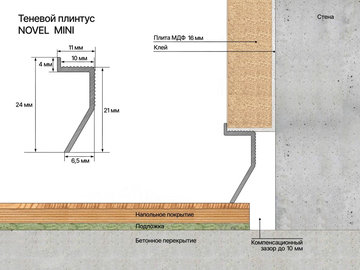 Теневой плинтус Novel не только создает эффект "парящей" стены, но и решает практические задачи. Бортик толщиной 4 мм маскирует неровности обрезанных панелей или штукатурки, а также защищает края отделочных материалов от случайных повреждений.